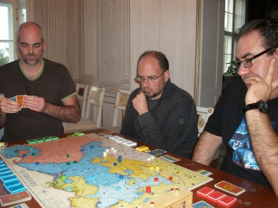 Bjorn versammelt zielstrebig drei Generäle in Sachsen und baut einen Turm mit 23 Armeen (genau richtig um gegen einen 24-Armeen-Turm Österreichs ein automatisches −1 zu nehmen). Ferdinand wird auf die Schweden losgelassen, während Seydlitz die Franzosen an der Pik-Herz-Grenze vor Magdeburg erwartet. Durch die schwache Deckung Hannovers sammelt Alberto schnell Zielstädte ein, während Österreich Schlesien links liegen läßt und für einen Großangriff auf Sachsen mobilisiert. Alex Russen schickt Lehwaldt schnell vom Brett, aber ignoriert zunächst den Verteidiger Kammins. Stattdessen ziehen Saltikow und Fermor Richtung Berlin. In Runde 6 bietet Bjorn in Sachsen eine Einkesselung an. Peter nimmt dieses Angebot an, und es kommt zu einer heißen Karoschlacht: Österreich unterliegt knapp mit −3 verlor. Währenddessen schlagen die Russen einen Troß südlich von Berlin und ziehen dann Richtung Stettin, und Frankreich erobert alle Zielstädte außer Magdeburg und Halberstadt. In Runde 7 greift Alberto mit allen 3 Generälen den einsamen preußischen Wächter Magdeburgs an. Französisches Pik gegen preußisches Herz. Preußen gelingt es hierbei, Frankreich alle Pik zu ziehen. Direkt danach schließt Schweden Frieden. Ferdinand ist nun wieder frei und zieht zurück nach Hannover. Peter erkennt Frankreichs problematische Situation (kein Pik!) und schickt Cumberland bei Haldensleben vom Brett, um zu verhindern, daß Seydlitz für Sachsen verfügbar wird. In Runde 9 entschließt sich Bjorn den französichen Turm mit Seydlitz erneut anzugreifen. Diesmal ist es Pik gegen Pik. Alberto hat jedoch eine Reserve und kann sich um −1 zurückziehen. Der preußische General ist unversorgt und wird umgedreht. Anschließend blockiert Frankreich alle Wege zurück ins preußische Heimatland und Seydlitz geht vom Brett (Runde 10). Direkt davor stirbt die Zarin und Alex übernimmt die Reichsarmee. Die Verteidigung Magdeburgs und Halberstadts liegt nun ganz in den Händen von Schwerin. Alex erkennt das Prekäre der Situation nicht und greift ebendiesen an. Schwerin geht vom Brett und somit ist das Erobern der letzten Zielstädte für Frankreich kein Problem. Alberto siegt in Runde 10 und ist der neue Friedrich-Weltmeister! |