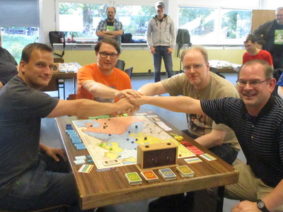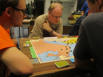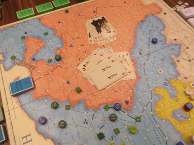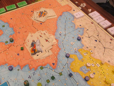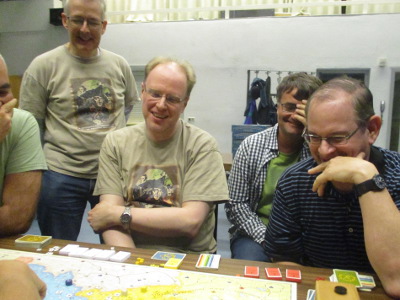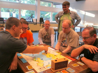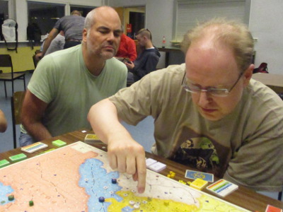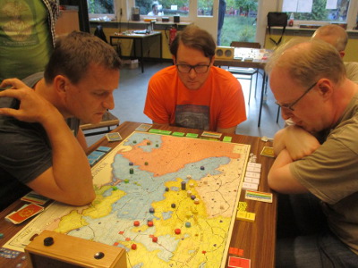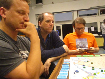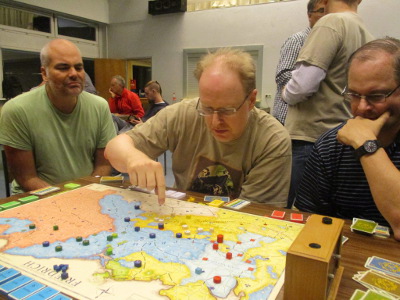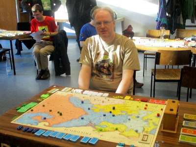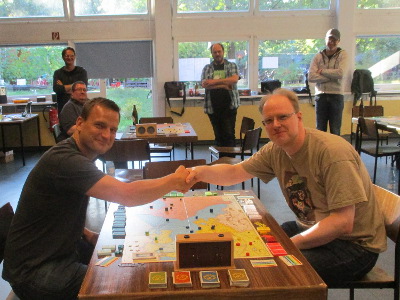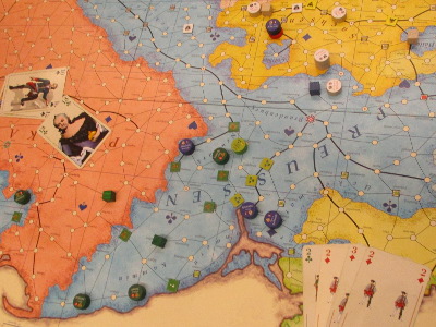Ich hatte meine Hauptstreitkräfte in Schlesien stationiert. Österreich entschied sich recht bald zunächst nach Sachsen zu marschieren. Durch geschicktes Manövrieren von Friedrich, Winterfeldt und Seydlitz konnte ich einen frühen Angriff von Browne und Karl verhindern (potentielle Gegenangriffe über Sektorengrenzen). Dadurch schaffe ich es, Schwerin von Schlesien nach Sachsen zu bringen, bevor Österreich angreifen kann. Leider ist mein Karo doch nicht so gut wie erhofft und ich muß nach zwei verlustreichen Kämpfen den Sektor um Dresden räumen. Österreich erobert Radeberg. Kreuz bekomme ich hingegen ausreichend. Russland kann in Kammin nichts erobern und holt sich lediglich Küstrin. Heinrich hält die Schweden ein wenig auf, bevor er bei Magdeburg gebraucht wird. Auch gegen die Reichsarmee stehe ich zunächst auf Kreuz (Winterfeldt), so daß Hildi nichts erobern kann, ehe ihm Lacy ihm zu Hilfe kommt. Hannover kann Frankreich ein wenig aufhalten. Diepholz wird nicht attackiert. Allerdings muß Cumberland nach einigen Scharmützeln unversorgt in Westsachsen vom Brett. Christian setzt nun auf einen Sieg der Reichsarmee. Meine Generäle schwärmen aus, um den Marsch der österreichischen Truppen zu verzögern, und um ggf. auch Hildi zu attackieren. Zu diesem Zeitpunkt glaube ich Österreich in Karo deutlich unterlegen zu sein – was wohl eine Fehlannahme ist (wie sich später herausstellt, hatte auch Österreich kaum Karo). In Schlesien attackiert Österreich meinen Keith in Unterzahl (Karo). Durch wiederholte Rückzüge versuche ich wieder Karo-Oberhand zu bekommen, ohne allzu viele Zielstädte aufzugeben. In Runde 6 kommt Indien mit der ersten Schicksalskarte. Eine gute Nachricht! Österreich bekommt nur noch 4TK! Sachsen erfordert Aufmerksamkeit, viel Gehirnschmalz und viel Zeit. Es gibt auch einige kleine Kämpfe in Herz zwischen Preußen und Österreich. Irgendwann zieht Christian einen preußischen General falsch zurück und verliert dadurch seinen Troß in Südsachsen. Österreich muß sich erstmal zurückziehen, um seine Generäle östlich von Dresden versorgt zu bekommen. Ich erwarte nun einen Endkampf in Schlesien und schicke vorsorglich einen weiteren General zu Keith. Rußland (Andreas) greift immer wieder in Kreuz an, Dohna vermeidet Kämpfe so weit möglich. Ich fühle mich weiterhin stark in Kreuz. Lehwaldt geht in Ostpreußen vom Brett und kümmert sich um Malchin. Ferdinand muß sich bei Diepholz gegen zwei Generäle erwehren. Nachdem er den Franzosen einiges an Herz und Zeit gezogen hat, geht er vom Brett. Cumberland kann sich bei Magdeburg positionieren. Gegen die französische Übermacht spielt er das gesamte Hannover-Herz und 4 Reserven, bevor er vom Brett geht. Runden 13 und 16 bringen Subsidienkürzungen für Preußen. Zudem kommt noch ein fünfter TK-Stapel ins Spiel. Zunächst unbemerkt kippt dadurch meine Kreuzüberlegenheit in Kammin. Denn Rußland bekommt durch den fünften Stapel plötzlich viel Kreuz! Ich merke das aber nicht und schätze die Kamminstellung weiterhin als sicher ein. Nachdem Christian die Versorgung in Sachsen wieder hergestellt hat, setzt er erneut auf einen Sieg der Reichsarmee. So spät im Spiel noch! Einige Runden später kann ich kaum noch Torgau halten (die letzte Zielstadt der Reichsarmee). In Runde 18 greife ich aus purer Verzweiflung in Karo an, um Torgau nicht nur von Herz aus decken zu können. Erstaunlicherweise gewinne ich den Kampf gegen Österreich!! Aber werde ich den kommenden kombinierten österreichisch-imperialen Angriffen standhalten können? Sicher werde ich in Runde 19 vertrieben werden, und so sehe ich in Hildi schon den sicheren Sieger! Zudem ist es kritisch in Kammin geworden: Nachdem ich mit Dohna in Runde 17 all mein Kreuz gespielt habe, ziehe ich ihn Runde 18 hinter die Sektorengrenze auf Rummelsburg zurück. Von dort deckt er noch Colberg und Neu-Stettin. Dieser Zug war ein Fehler. Ich hätte in Kreuz bleiben müssen und mich mit Reserven zurückziehen müssen. Andreas nutzt meinen Fehler und blockt meine Wege zurück nach Kreuz. (Erklärungen für meinen Fehler: Ich war schon auf Stoppuhrzeit und sah nicht so weit voraus; außerdem dachte ich die Reserven in Sachsen zu brauchen.) Es sieht schlecht aus für Preußen. Ich erwarte die Niederlage. Bei Hannover sind leider beide Generäle gleichzeitig vom Brett. Das hätte ich besser spielen können. Frankreich kämpft um Magdeburg gegen Preußen, verliert den Herzkampf aber deutlich. Ich vermeide, beide Hannoveraner neu einzusetzen (sie hätten sofort kämpfen müssen), da ich nur wenige Hannover-TK habe. Dennoch, ich hätte beide neu einsetzen müssen – aber dieser Fehler bleibt ohne Folgen, da Frankreich in Runde 18 ausscheidet. Und damit wechselt auch die Reichsarmee den Spieler. Puhh! Runde 19.