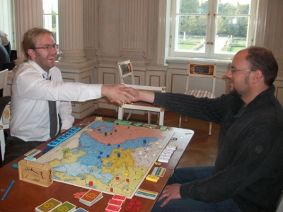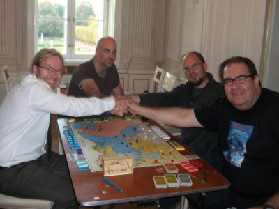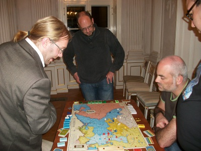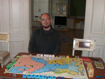 Bjorn quickly concentrates 3 generals in Saxony for 23 troops stack (which allows him an automatic −1 retreat against the expected 24 troops stack of Austria). Ferdinand makes pressure against Sweden, while Seydlitz awaits the French at the hearts-spades sector border just before Magdeburg. Due to the weak defense in Hanover, Alberto rapidly conquers objectives, while Austria ignores Silesia for the mmoment, gathering his troops for a big offensive in Saxony. Alex manages to annihilate Lehwaldt very fast, and bypasses the defender of Kammin. Instead Saltikow and Fermor advance towards Berlin. In turn 6, Bjorn offers an encirclement in Saxony. Peter dares the attack, and a furious diamonds battle is fought. Austria loses that battle narrowly by −3. In the meantime, the Russians eliminate a Prussian supply train south of Berlin and move nortwards to Stettin thereafter, and France has taken all objectives except Magdeburg and Halberstadt. In turn 7, Alberto attacks with all 3 generals stacked the sole guard of Magdeburg. French spades vs Prussian hearts. Bjorn manages to empty the French spades hand completely. Directly thereafter, Sweden makes peace. This sets Ferdinand free, and he moves back to Hanover. Peter realizes that France is in trouble (due to the lack of spades). He fears that Prussia needs no general against France (since Hanover has spades, while France has not), and so he eliminates Cumberland near Haldensleben. In turn 9, Bjorn decides to attack the French triple stack again. This time it is spades vs spades. However, it is not the expected blow out, since Alberto has a reserve and manages a cheap retreat. The Prussian general (Seydlitz) is oos and flipped. Alberto makes best use of that by blocking all paths back to Prussia, and so Seydlitz starves in turn 10. Just before his starvation, the Tsarina died, and Alex took over the Imperial army. Now, the defense of Magdeburg and Halberstadt is solely the task of Schwerin. Alex, the new imperial commander, does not realize that. He attacks Schwerin, eliminating him. And so it is easy for Alberto to conquer his last objectives. He wins after 10 turns and becomes the 2014 Friedrich World Champion! |