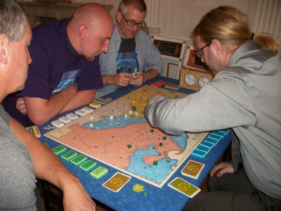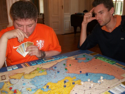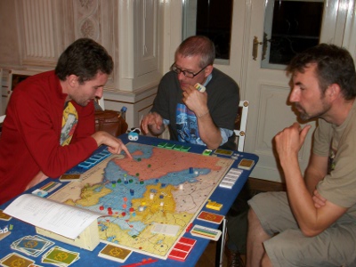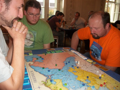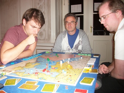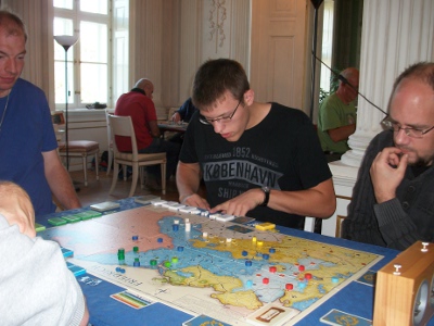 Game 1: Stefan Senger loses with Prussia after early subsidy reductions (turn 6 and 8). After 11 turns Russia (Bjorn Apelqvist) and Austria (Raphael Sümpelmann) win simultaneously. Game 2: T. Franke suffers a quick defeat, and one of a special tragic: After turn 8 France quits the game, and Anton Telle takes over the Imperial Army and is the sudden winner of this game! That's because Andreas Zölitz had already conquered all 1st order. And Andreas is double unlucky, since his Austrians score only 3.3 points. Game 3: Bjorn von Knorring is defeated quite fast as well. After 11 turns Andrew Brown's Austrians win. Game 4: Steffen Schröder withstands the attacks of his opponents quite long. However, after 18 turns Christian Blattner (Austria) and Alex Calderón (Russia) overcome his defense at the same time. Game 5: Mark Luta's Prussia is defeated after 14 turns in a game with only few stroke of fates. Winner is Niclas Büchel (Austria). Game 6: Peter Hannappel is the first to win with Prussia. He dominated his opponents quite well, even occupying the Imperial depot city. Poor Hildi! Game 7: Alberto Romero follows the advice of his Spanish team-mates: "Never attack with Prussia". And so he is holding out until turn 18. The game ends with a triple victory of Sweden, France and Austria (Stefan Schönweiß, Rainer Haslauer, Manni Wichmann, respectively). Game 8: Klaus Blum accomplishes the 2nd Prussian win of the evening. Besides him, only Austria (Arnold de Wijs) scored well (9.17 points). Game 9: Richard Sivél has no luck with the fate (Lord Bute with the first card), but a quite teethless Austrian player. However, Jose Bonilla Rau is pressing hard, and so a supply eat festival in Poland is started: Every turn between turn 10 to 15, Prussia eliminates one Russian supply train. Finally, Prussia wins after 21 turns. |