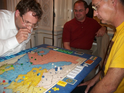 Game 10: Maurice de Wijs suffers early subsidy reductions (turn 7 and 11). Bjorn Apelqvist (France) wins after 11 turns, and also Christian Blattner and Christoph Kaminski were close to victory.. Game 11: This game ends after 11 turns with a Prussian defeat (Rainer Haslauer) as well. John McCulluoghs Russians are the winners, while Arnold de Wijs had no luck with France, and played with the Imperial Army already starting with turn 10. Game 12: Anton Telle, undefeated with Prussia for many years, loses his nimbus. Bernd Preiß (Russia), Jose Bonilla Rau (Austria) and Niclas Büchel (France) are concentrating his attacks massively, so that Anton is defeated after 13 turns. The strokes of fate were remarkable in this game as well: America (turn 6), Poems (7), India (8), Lord Bute (9), Sweden (10). Game 13: Andreas Buschhaus keeps the allies at bay until turn 20 and wins, partly favoured by an early exit of France (turn 7). Game 14: Guy Atkinson wins with Prussia in turn 22. Russia (Andrew Brown) left the game in turn 8, followed by Sweden immediately thereafter. And sending 24 Austrians (Richard Sivél) into starvation was helpful, too! Game 15: Thorsten Hennig's Prussians are defeated by Peter Hannappels French after 19 turns. Game 16: Stephan Jordan is unsuccessful with Prussia, too. Alberto Romero (Russia) wins in turn 16, just in the last minute before the Tsarina would have died. Game 17: Greg Rogers holds out long with Prussia. Already on the stop watch, he is finally defeated in turn 22. Winners are Bjorn von Knorring (Austria) and Andreas Zölitz (Imperial Army). Very bad luck for Greg, since in turn 22 the game would have ended with his win... Game 18: Alex Calderón, however, wins in turn 22. Raphael Sümpelmann (Russia), Manni Wichmann (Austria) and Rodrigo Witzel (France) tried all they could, but without success. |